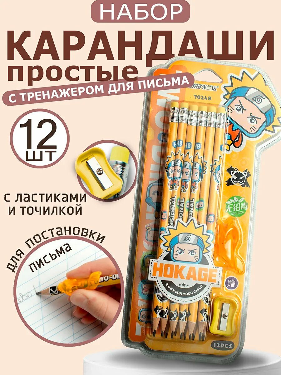 Карандаши простые заточенные с ластиками и точилкой Наруто интересное: