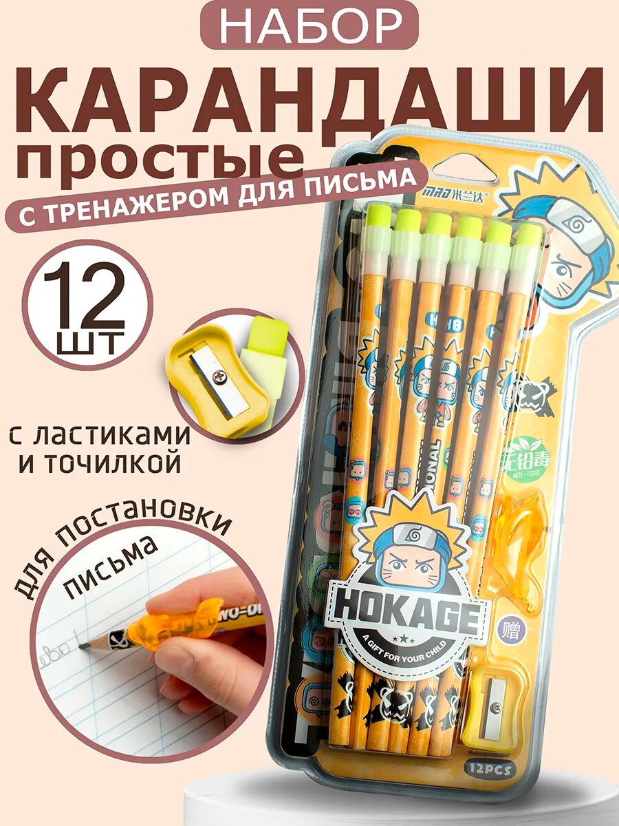Купить Карандаши простые незаточенные с ластиками и точилкой Наруто