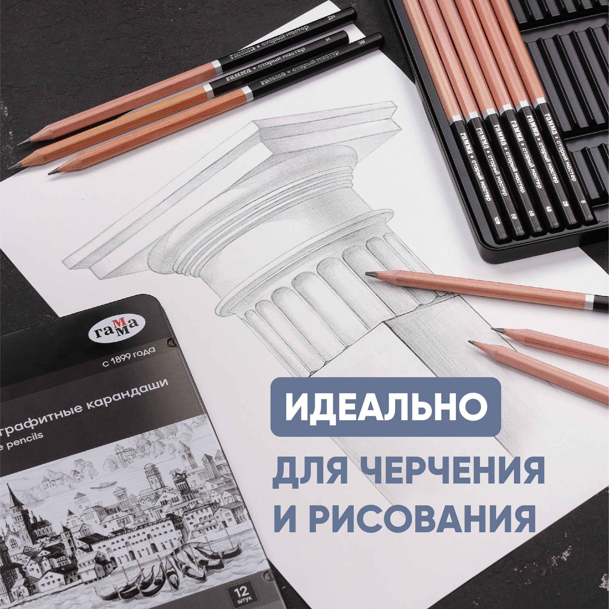 Карандаши простые чернографитные Гамма "Старый Мастер" / Набор карандашей "2Т-10М / 2Н-10В" 12 штук, шестигранные для графики, черчения, школы, рисования, скетчинга