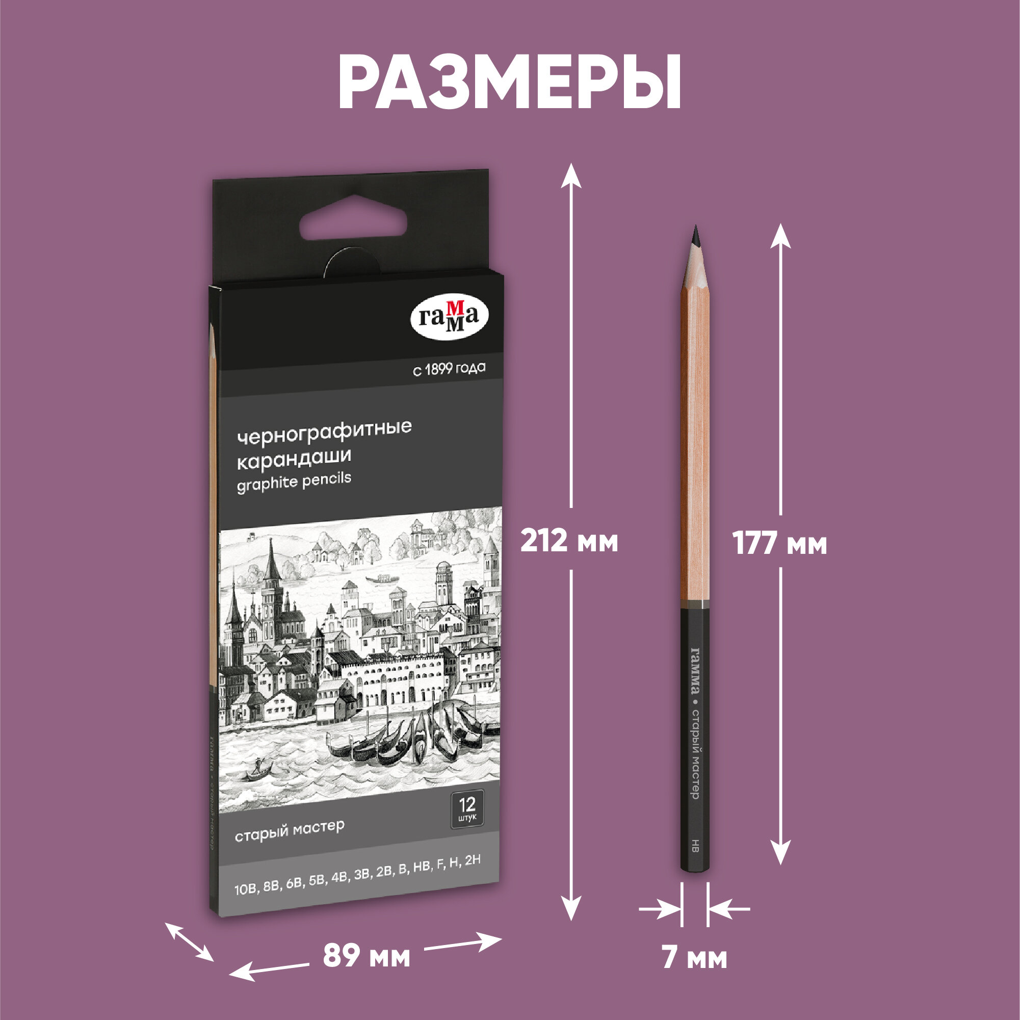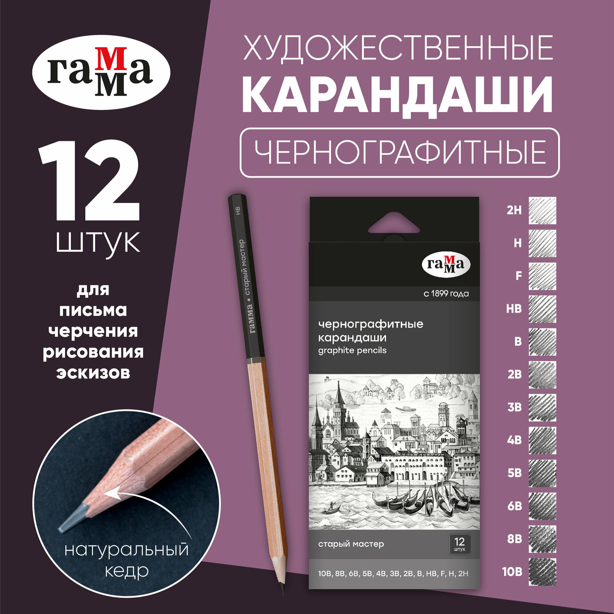 Купить Карандаши простые чернографитные Гамма "Старый Мастер" / Набор карандашей "2Т-10М / 2Н-10В" 12 штук, шестигранные для графики, черчения, школы, рисования, скетчинга