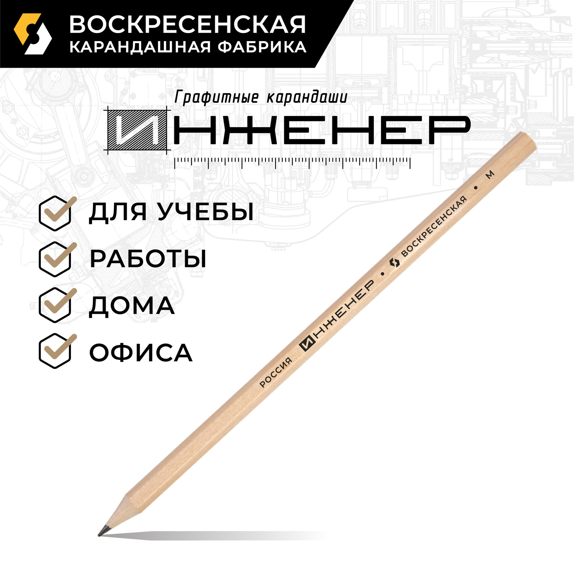 Карандаш ч/г Воскресенская карандашная фабрика "Инженер" 6М (6B), заточен, 72 штуки