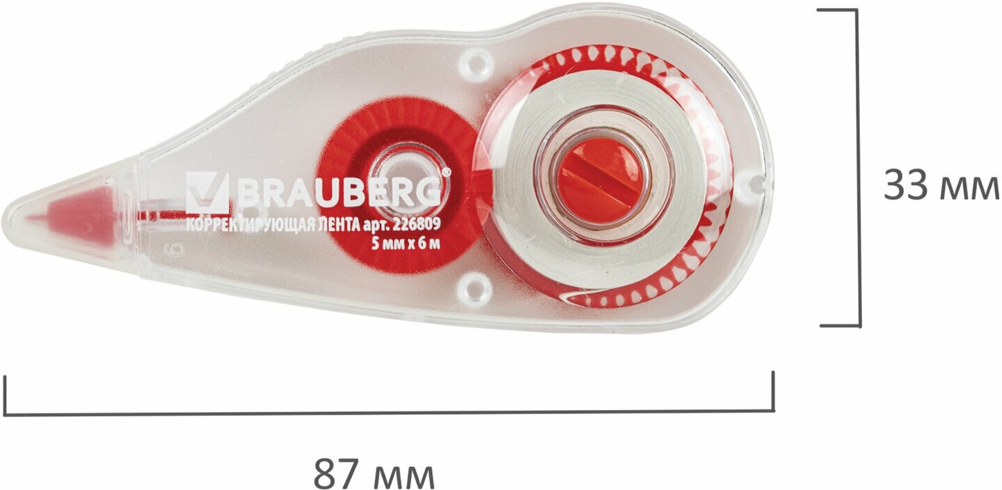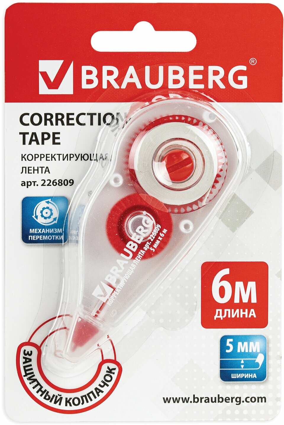 Купить Корректирующая лента/корректор/шрих/замазка Brauberg, 5 мм х 6 м, корпус красный, с подкручиванием, блистер, 226809