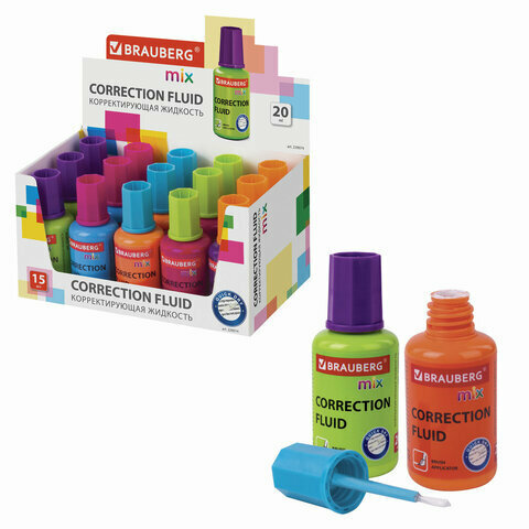 Купить Корректирующая жидкость BRAUBERG MIX, быстросохнущая, 20 мл, с кисточкой, ассорти, 229074