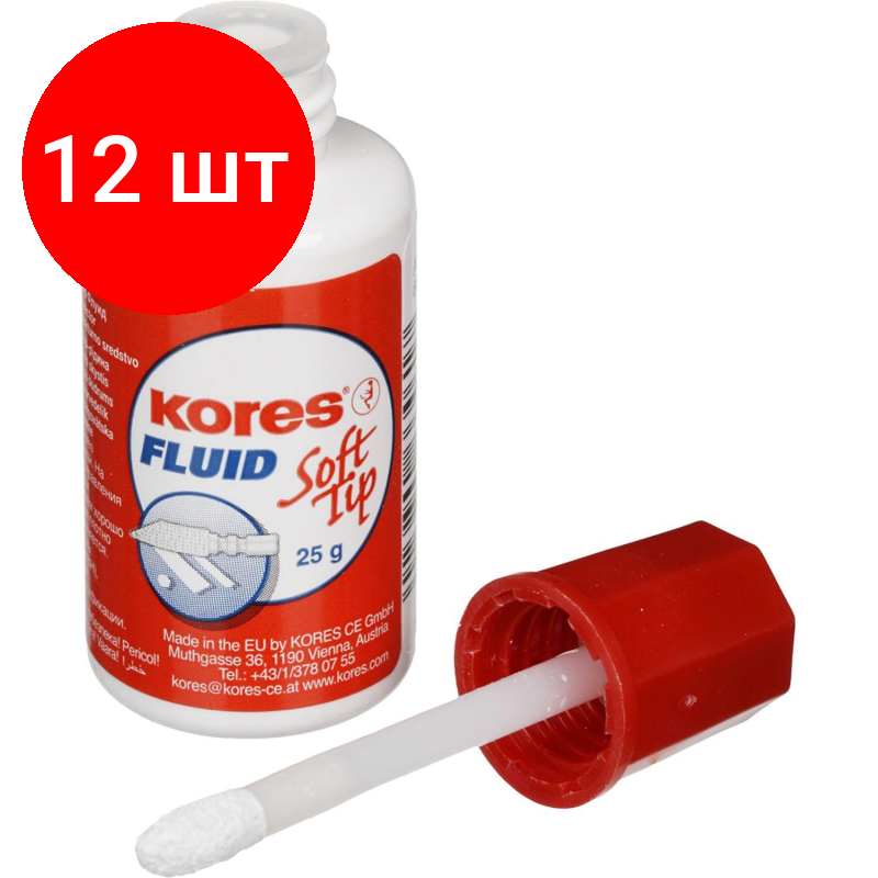 Комплект 12 штук, Корректирующая жидкость KORES Soft Tip FLUID 25мл на быстросохн осн, апплик интересное:
