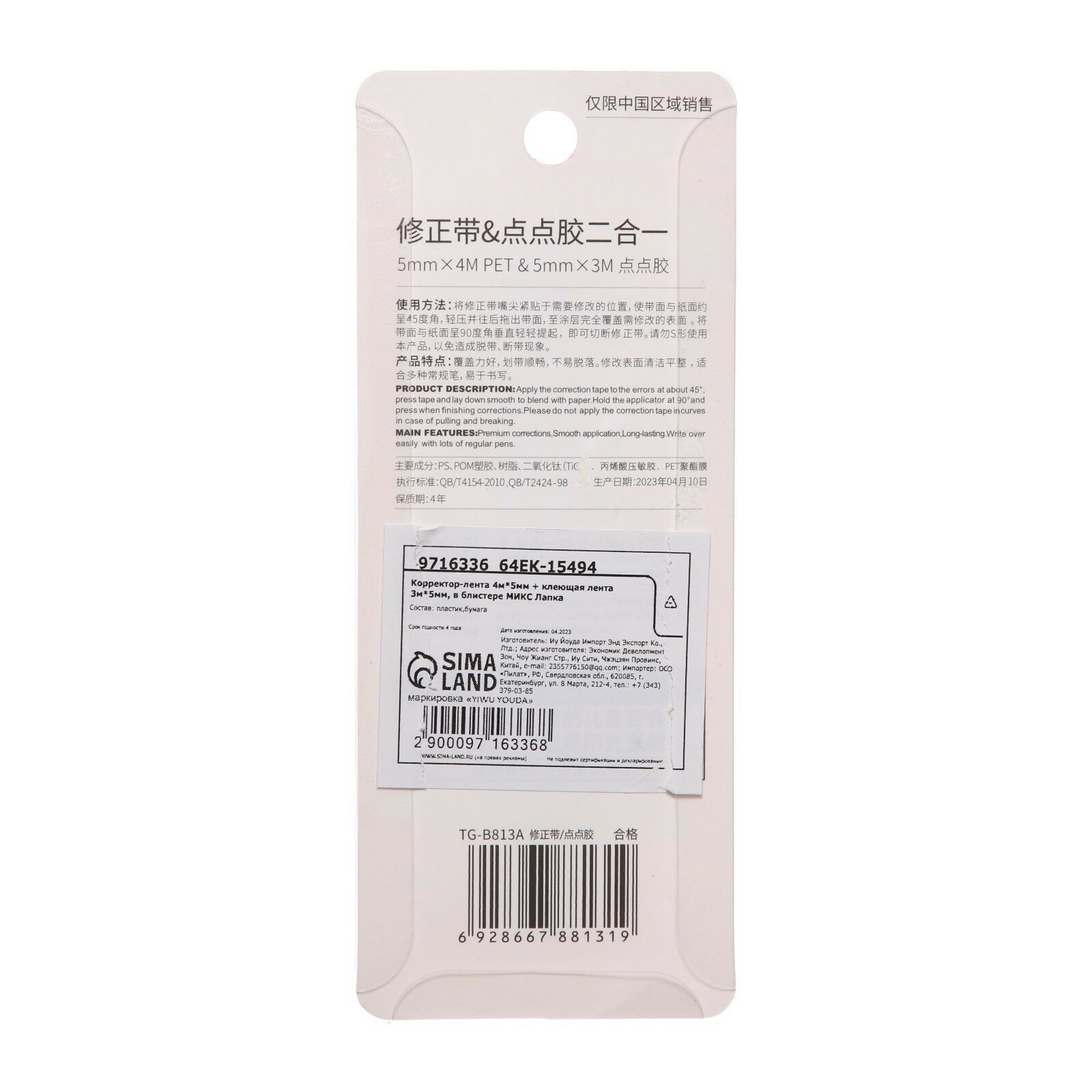 Корректор-лента 4м х 5мм + клеющая лента 3м х 5мм, в блистере "Лапка" микс интересное: