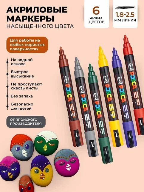 Набор акриловых маркеров, фломастеров Uni POSCA PC-5M 1,8-2,5мм Standard 6 цветов, на водной основе, для рисования