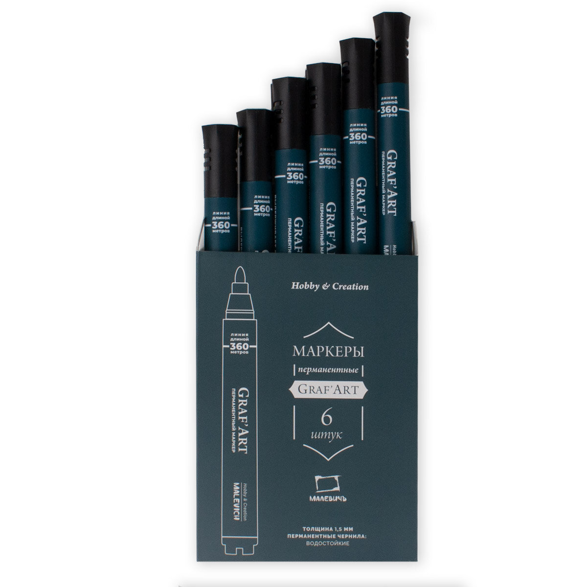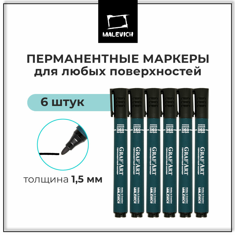 Купить Маркер перманентный Малевичъ, 1,5 мм, черный, набор маркеров 6 шт