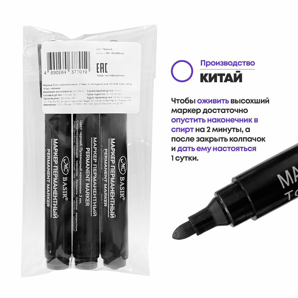 Маркеры MC-Basir "Перманентный черный", для любых поверхностей, 3 шт