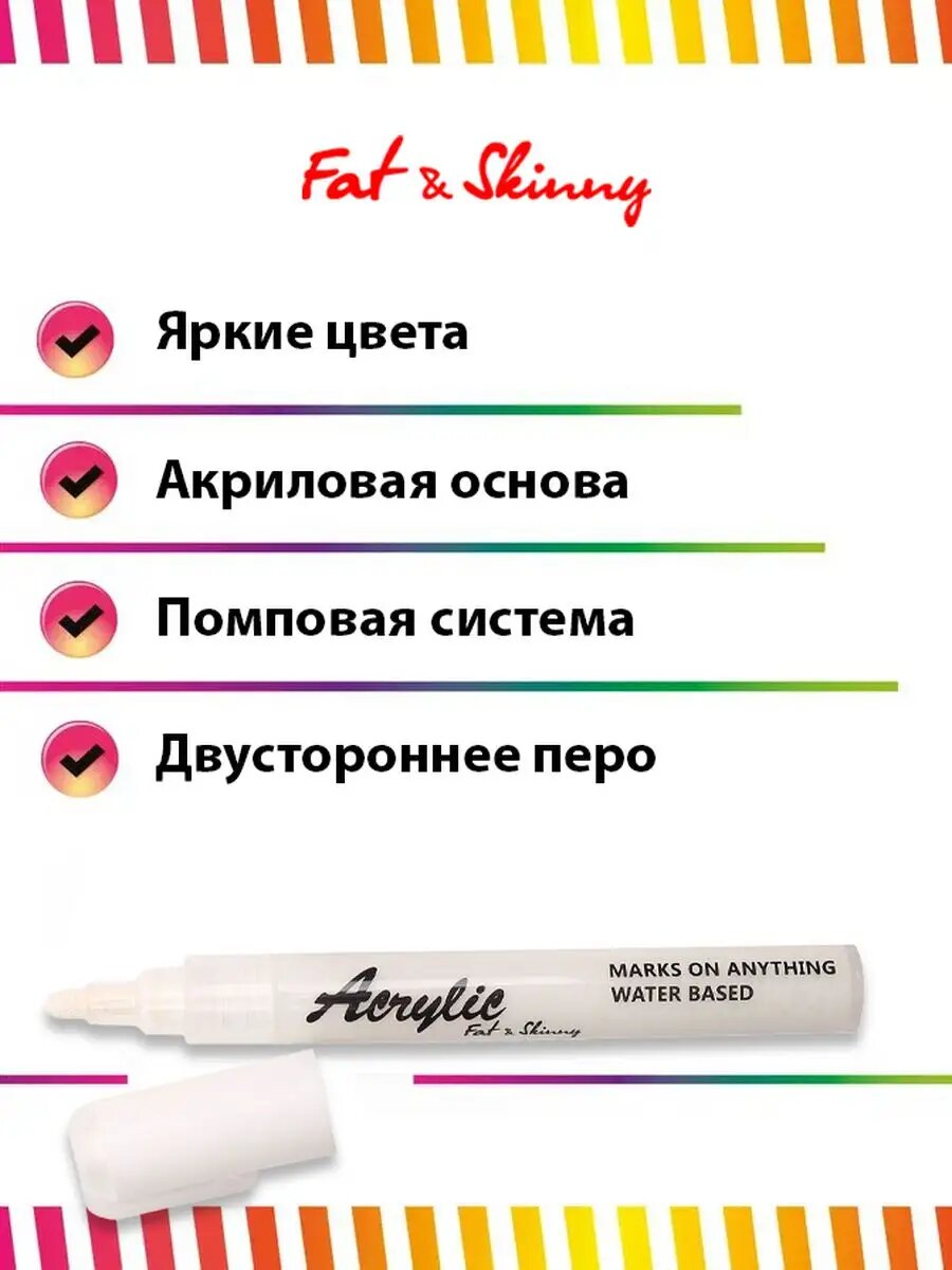 Ниже Вы можете прочитать отзывы на Акриловый маркер Fat&Skinny для рисования с двусторонним пером 2-5 мм белый, ознакомится с подробными характеристиками, посмотреть интересные обзоры и фотографии на Акриловый маркер Fat&Skinny для рисования с двусторонним пером 2-5 мм белый.