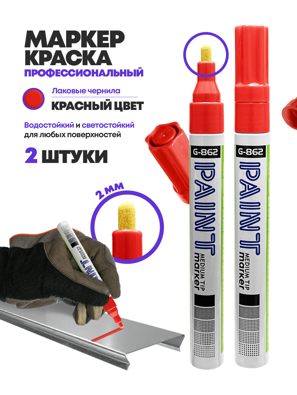 Купить Маркер-краска перманентный красный, набор 2 шт, несмываемый лаковый водостойкий фломастер строительный