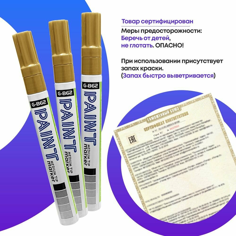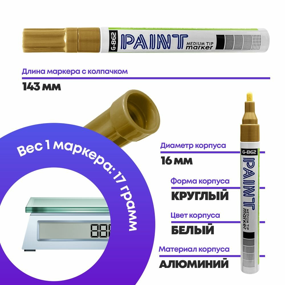 Купить Маркер-Краска MC-Basir Gixin, перманентный лаковый, круглый наконечник, золотой, 3 шт
