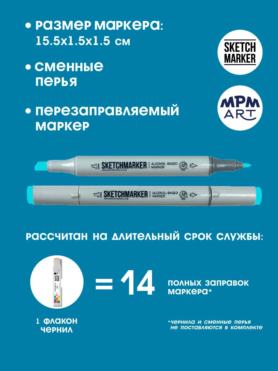 Двусторонний заправляемый маркер SKETCHMARKER на спиртовой основе для скетчинга, цвет: B14 Бермудская бирюза