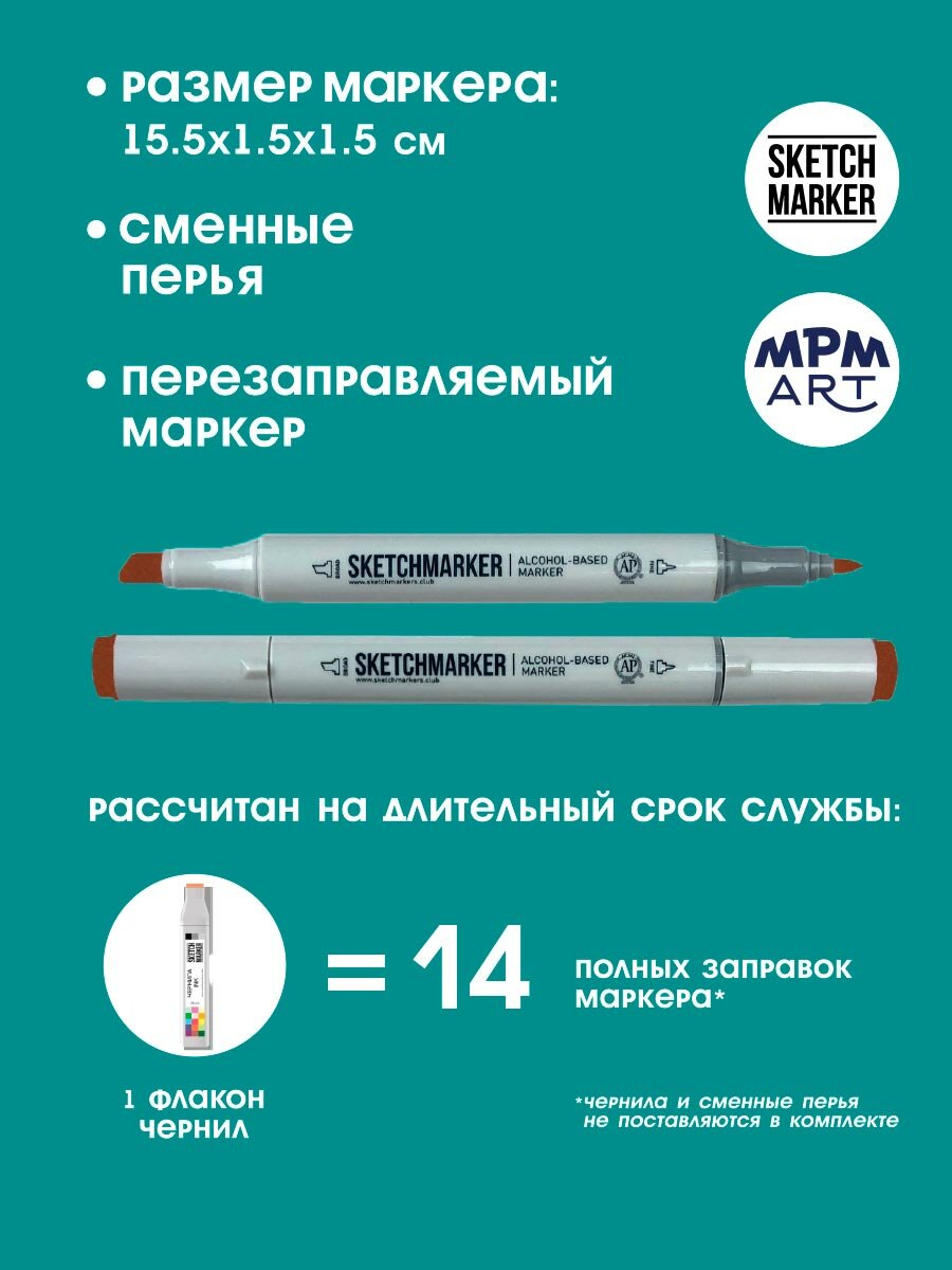 Двусторонний заправляемый маркер SKETCHMARKER на спиртовой основе для скетчинга, цвет: B14 Бермудская бирюза