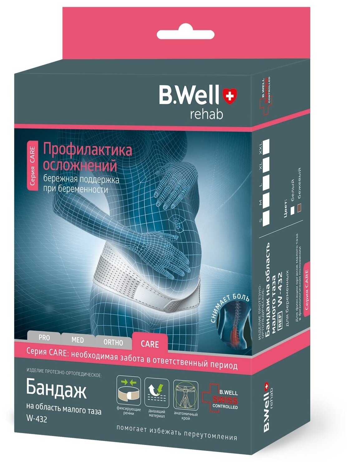 Бандаж д/беременных CARE W-432 на тазовую область с системой поддержки спины, 2 ребра жесткости, фиксирующие ремни, легкий, тонкий р.М/бел.