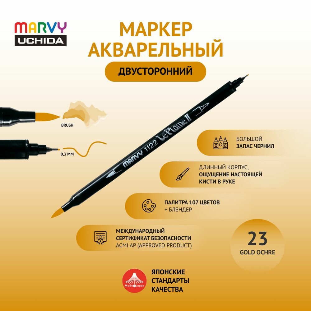 Купить Маркер Marvy Uchida для скетчинга акварельный двусторонний (кисть/капиллярная ручка 0.3мм)G золотистая охра MAR1122/23
