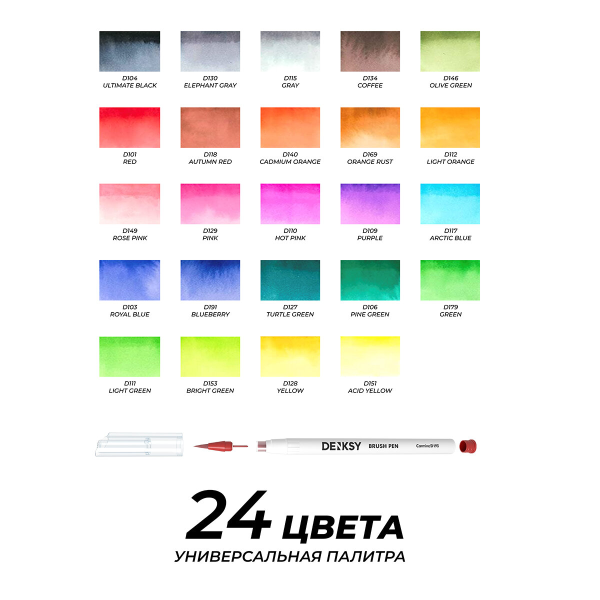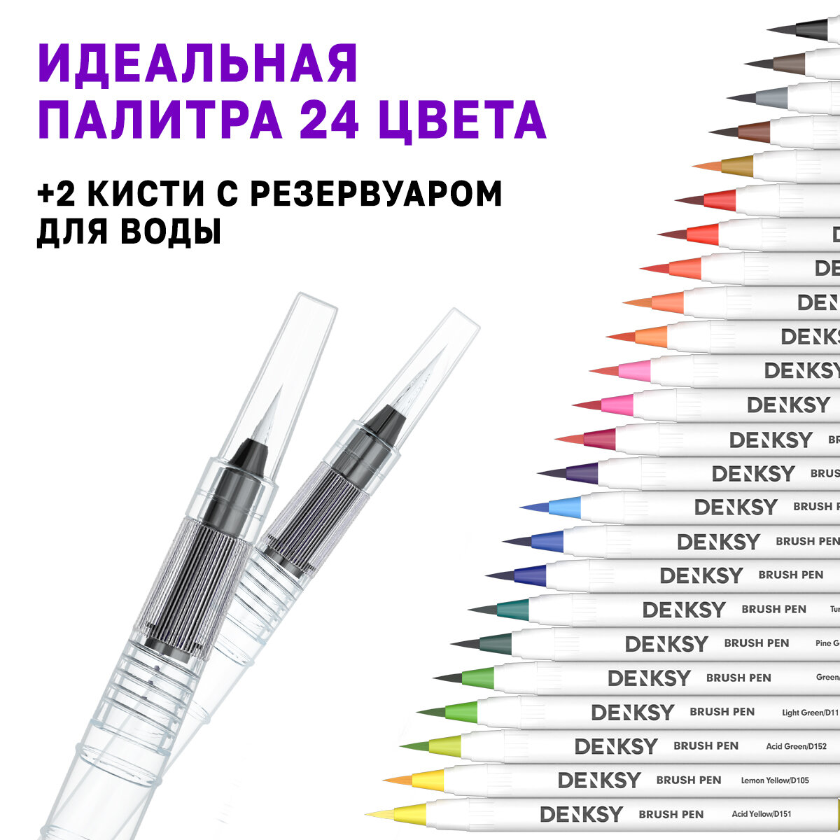 Купить Акварельные маркеры DENKSY 24 цвета в белом корпусе и 2 кисти с резервуаром