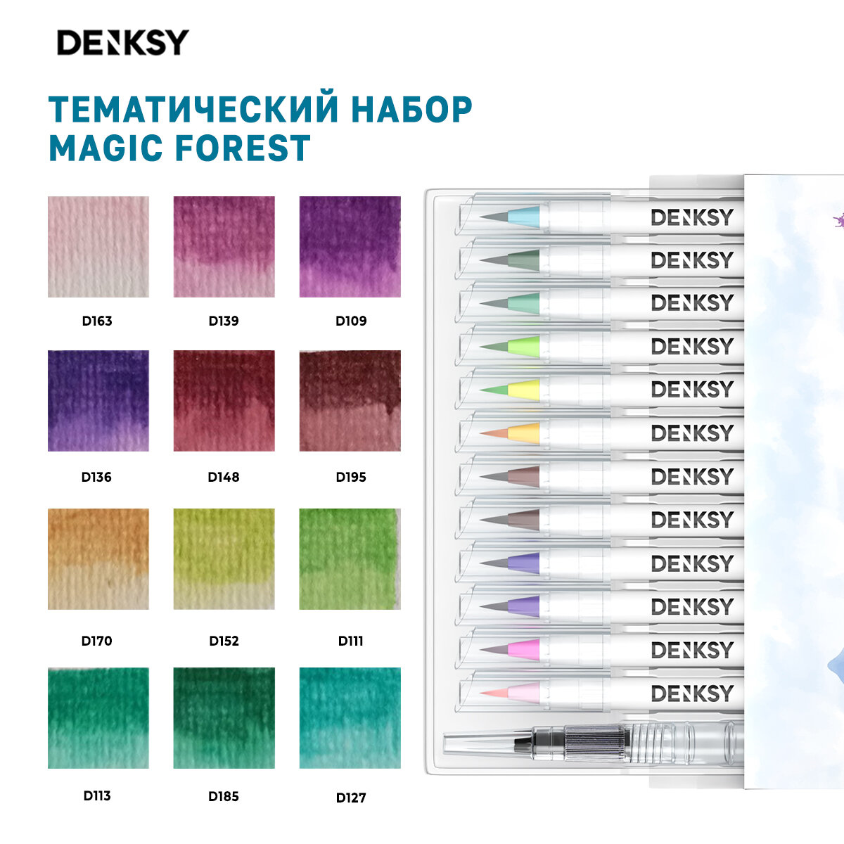 Купить Акварельные маркеры DENKSY 12 Magic Forest цветов в белом корпусе и 1 кисть с резервуаром