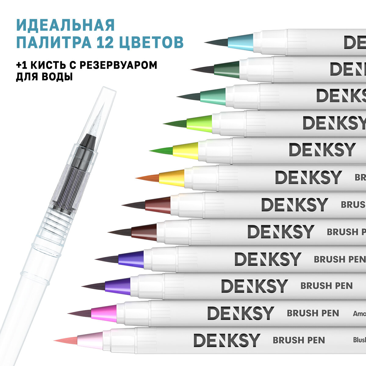 Акварельные маркеры DENKSY 12 Classic цветов в белом корпусе и 1 кисть с резервуаром