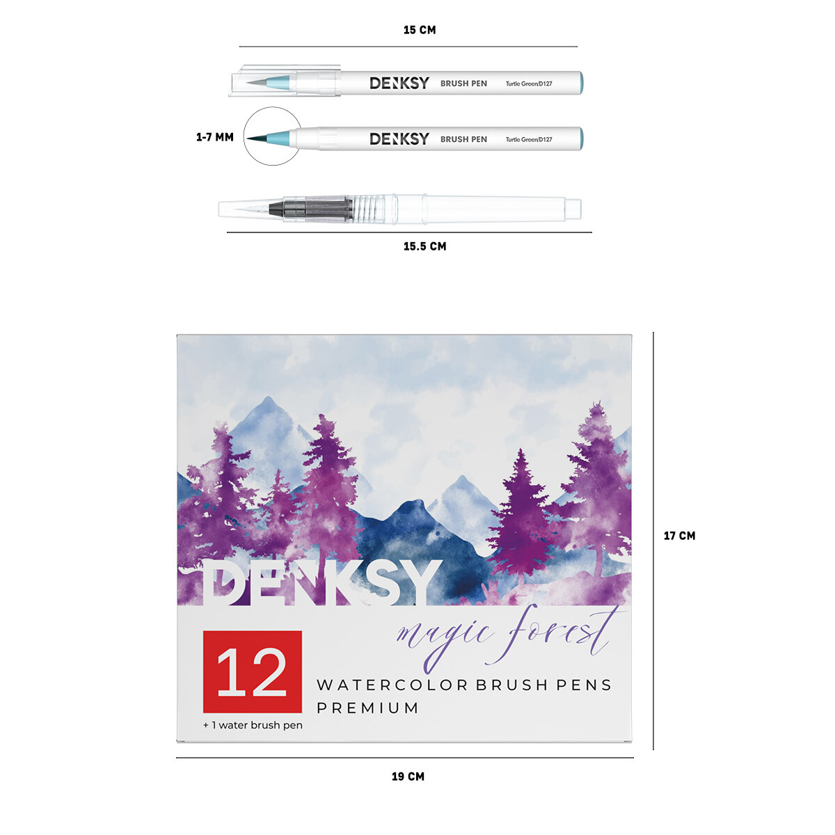 Акварельные маркеры DENKSY 12 Magic Forest цветов в черном корпусе и 1 кисть с резервуаром