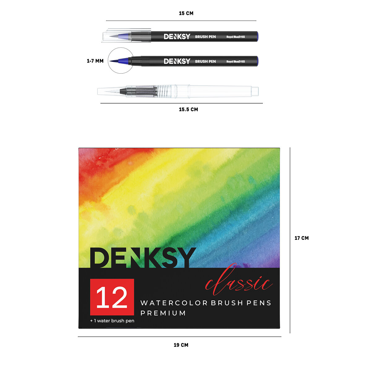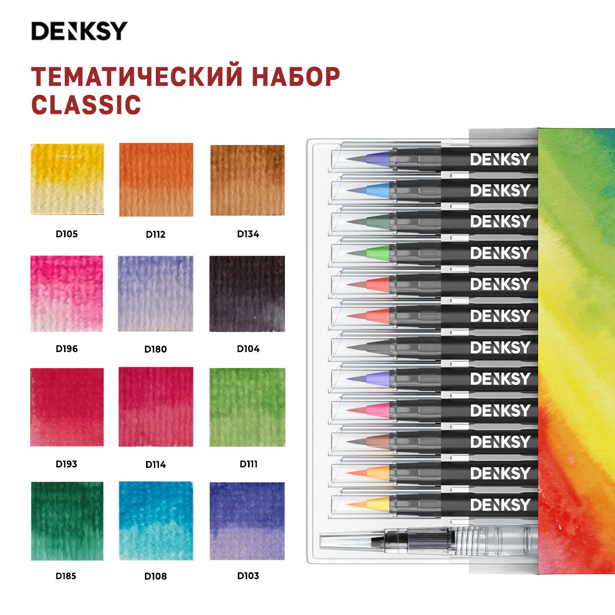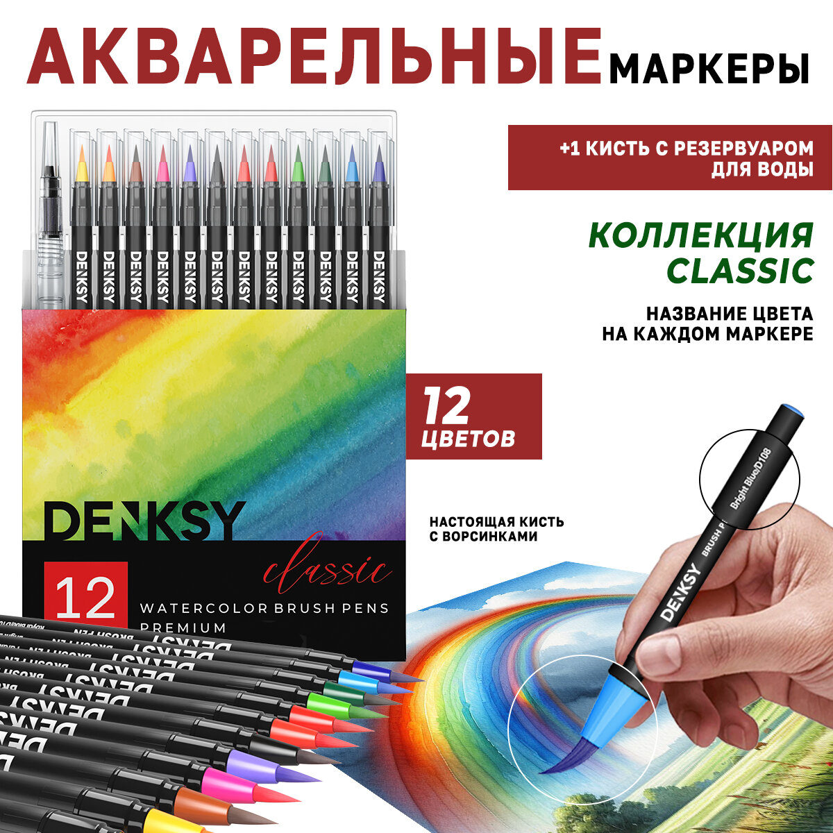 Акварельные маркеры DENKSY 12 Classic цветов в белом корпусе и 1 кисть с резервуаром