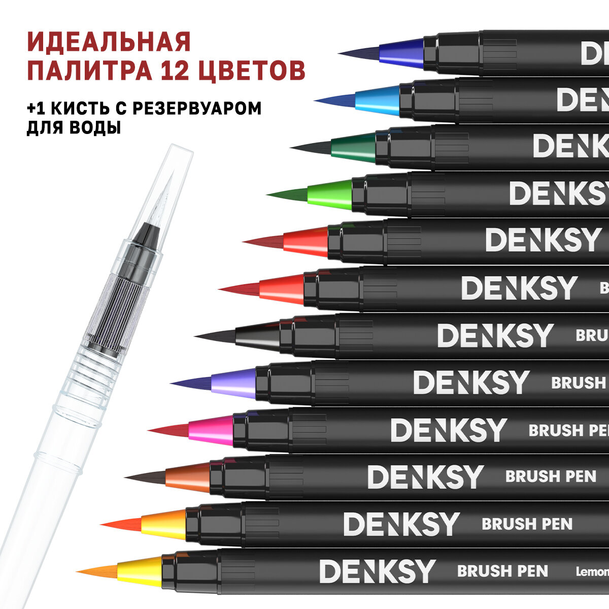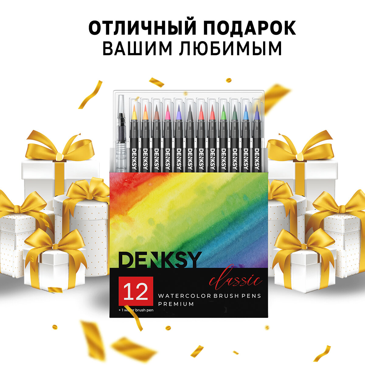 Купить Акварельные маркеры DENKSY 12 Classic цветов в черном корпусе и 1 кисть с резервуаром