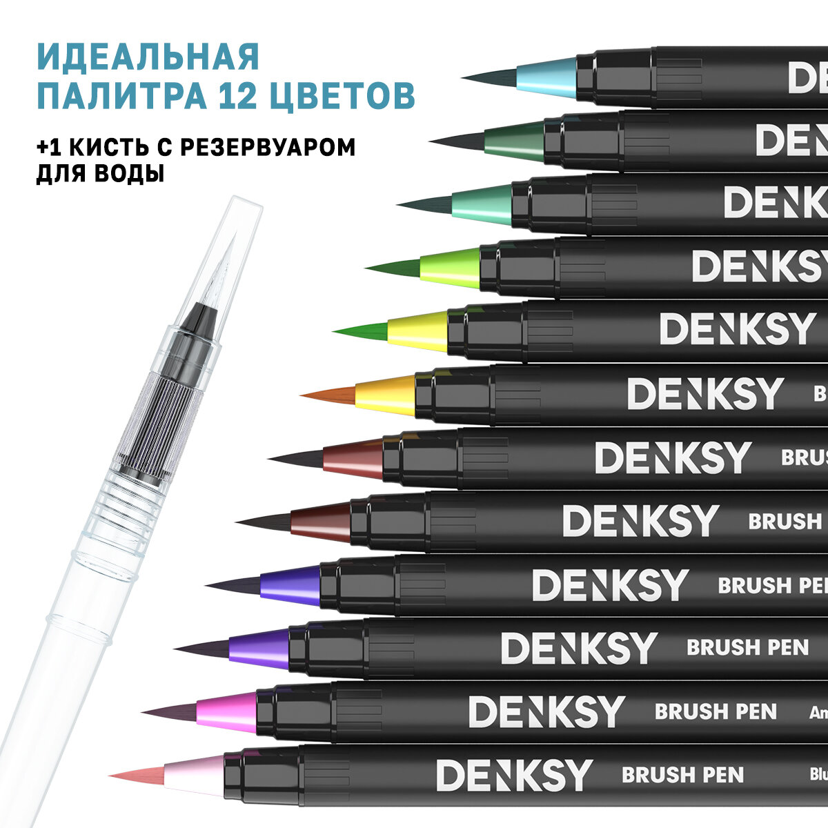 Акварельные маркеры DENKSY 12 Classic цветов в белом корпусе и 1 кисть с резервуаром