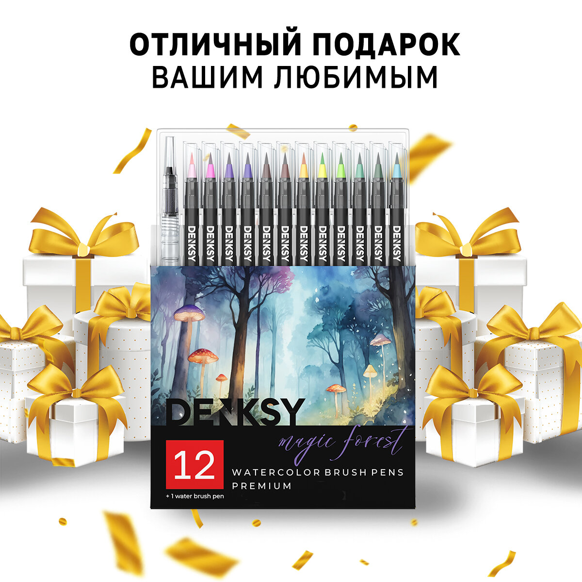 Купить Акварельные маркеры DENKSY 12 Magic Forest цветов в черном корпусе и 1 кисть с резервуаром