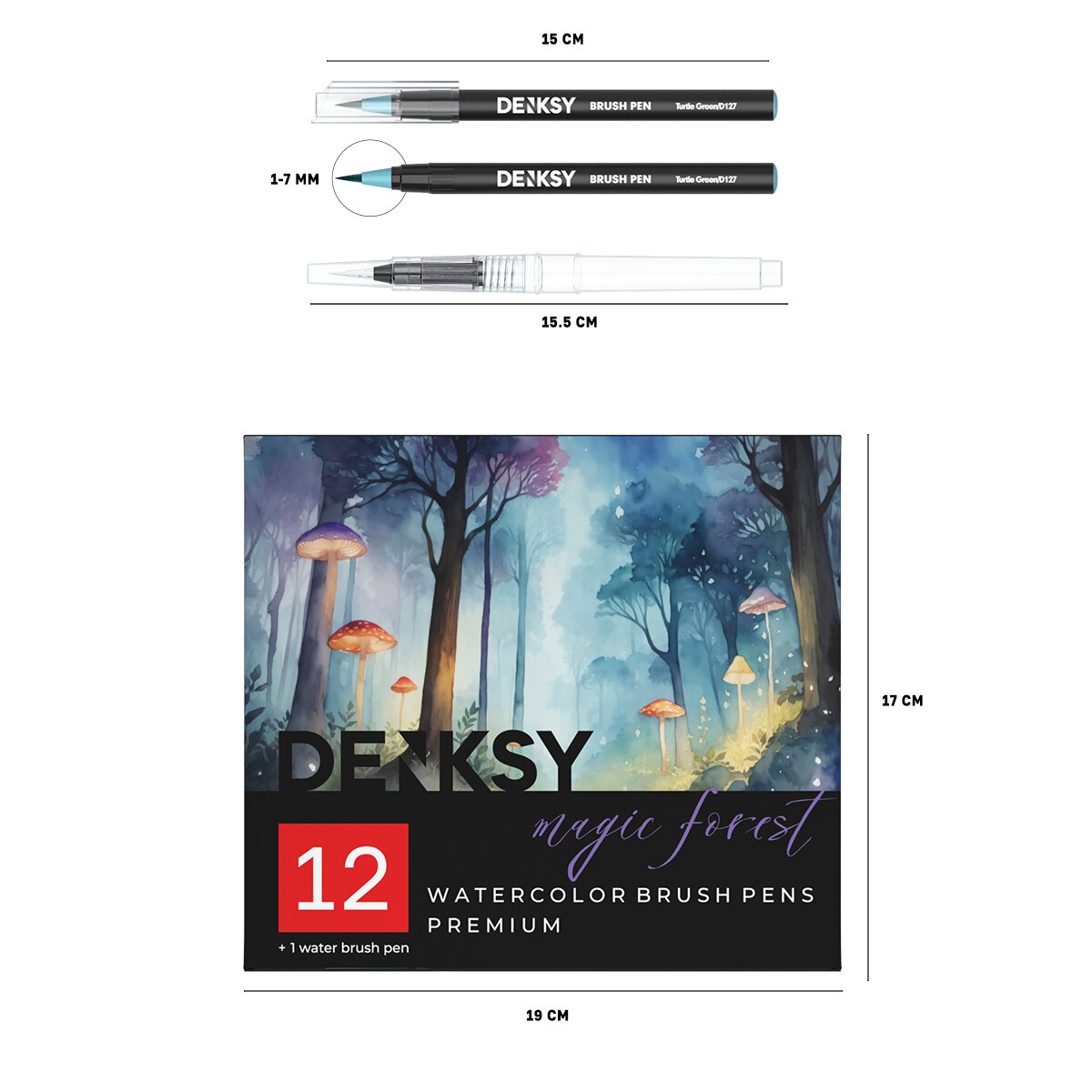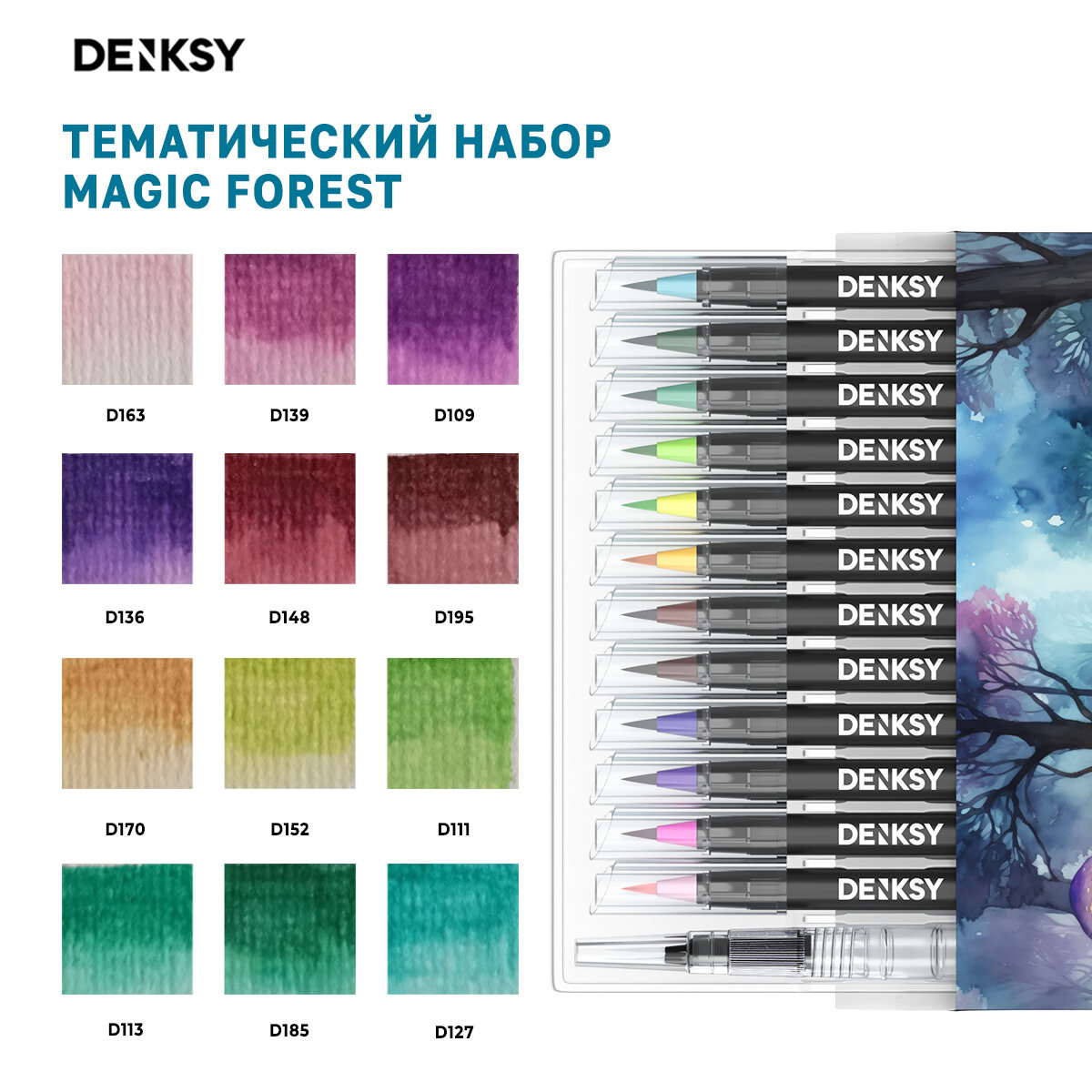 Акварельные маркеры DENKSY 12 Magic Forest цветов в белом корпусе и 1 кисть с резервуаром