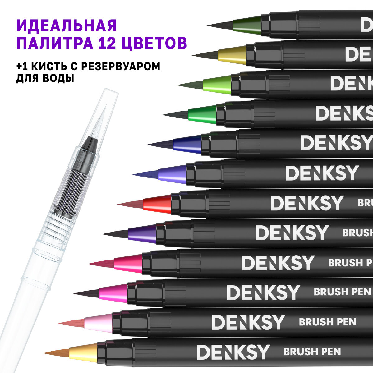 Акварельные маркеры DENKSY 12 Classic цветов в черном корпусе и 1 кисть с резервуаром