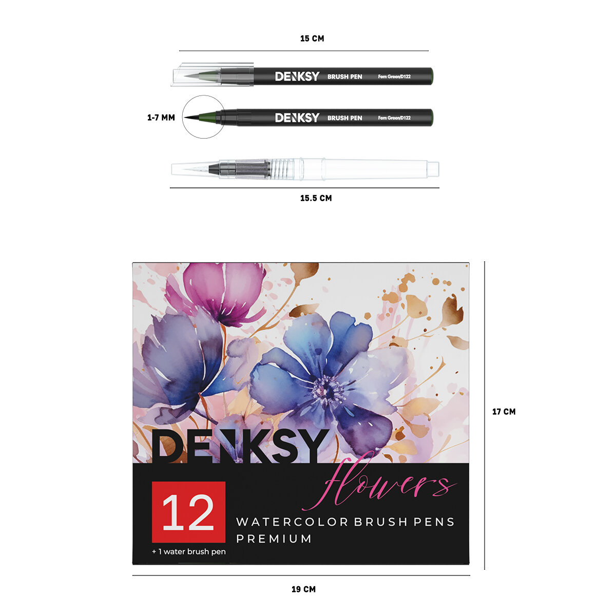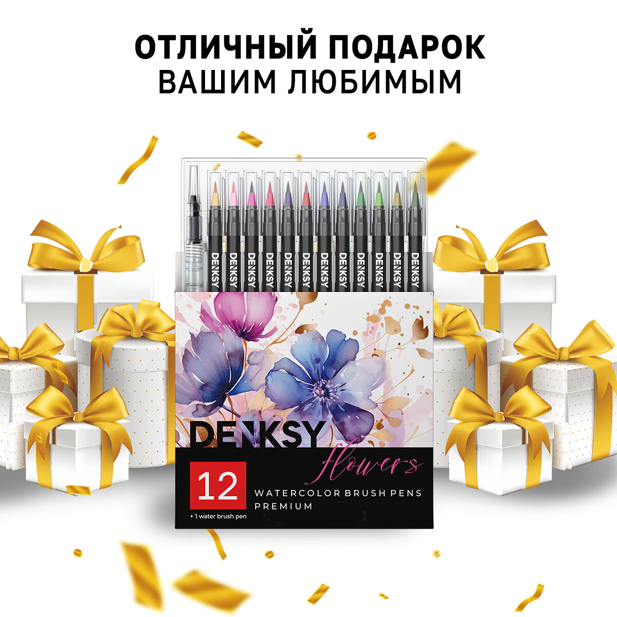 Купить Акварельные маркеры DENKSY 12 Flowers цветов в черном корпусе и 1 кисть с резервуаром