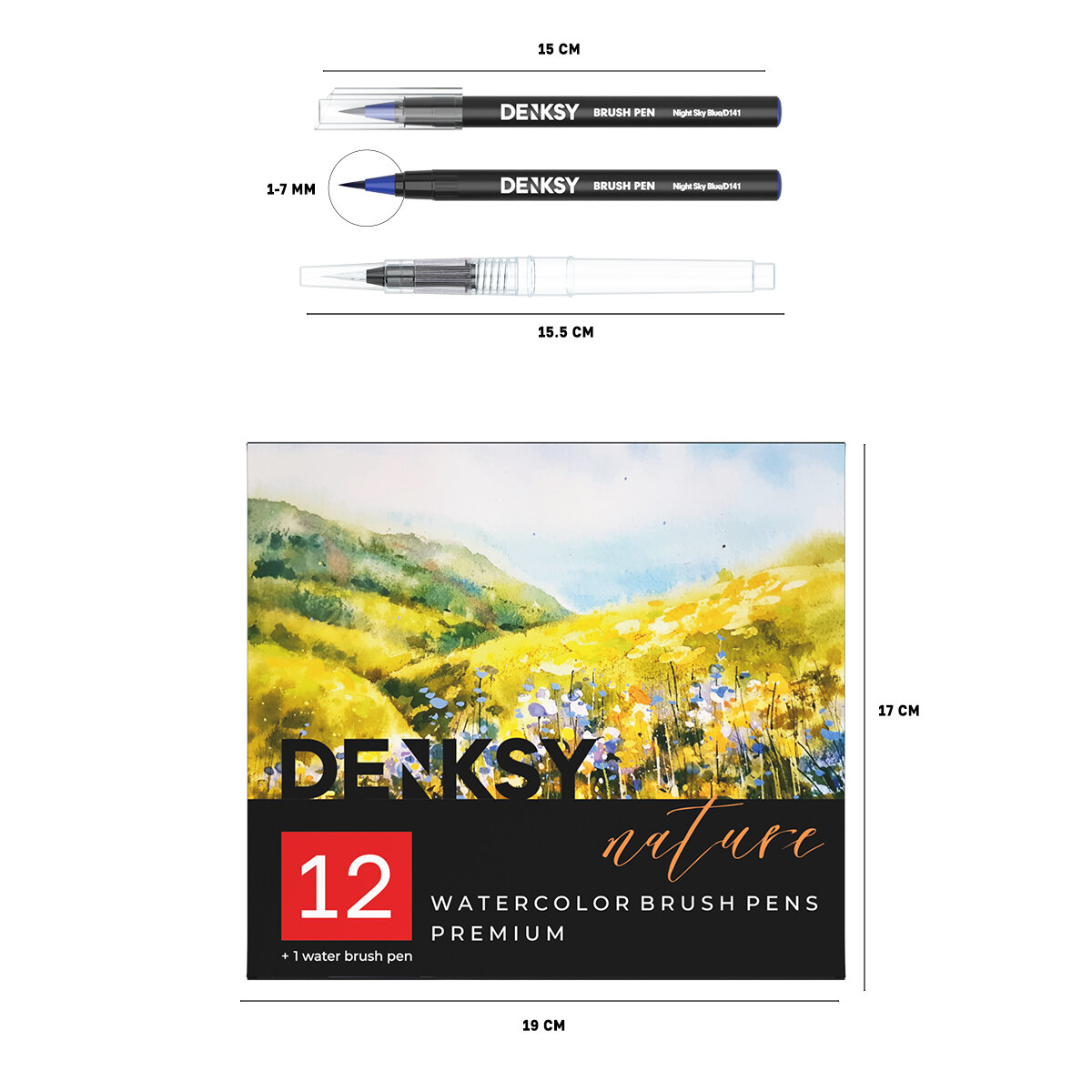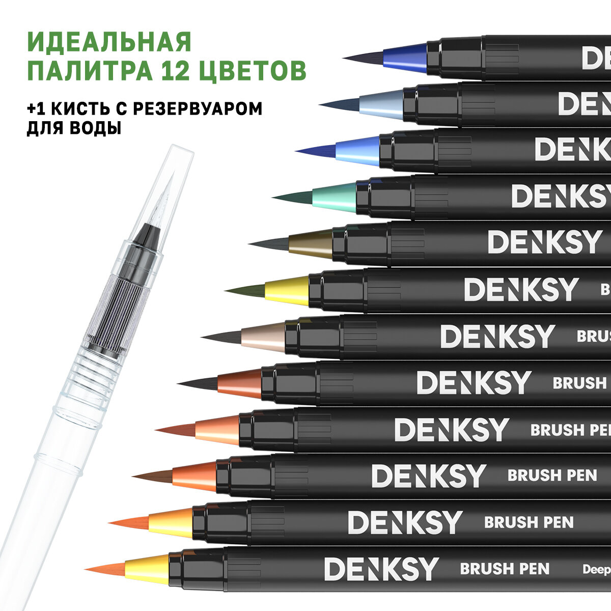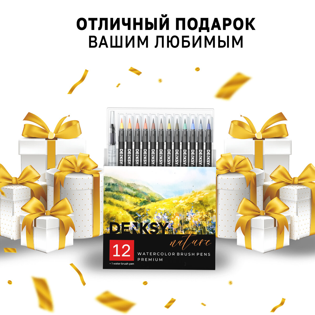 Купить Акварельные маркеры DENKSY 12 Nature цветов в черном корпусе и 1 кисть с резервуаром