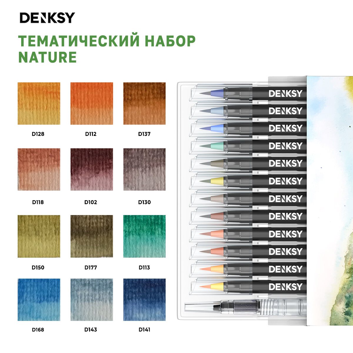 Акварельные маркеры DENKSY 12 Nature цветов в белом корпусе и 1 кисть с резервуаром