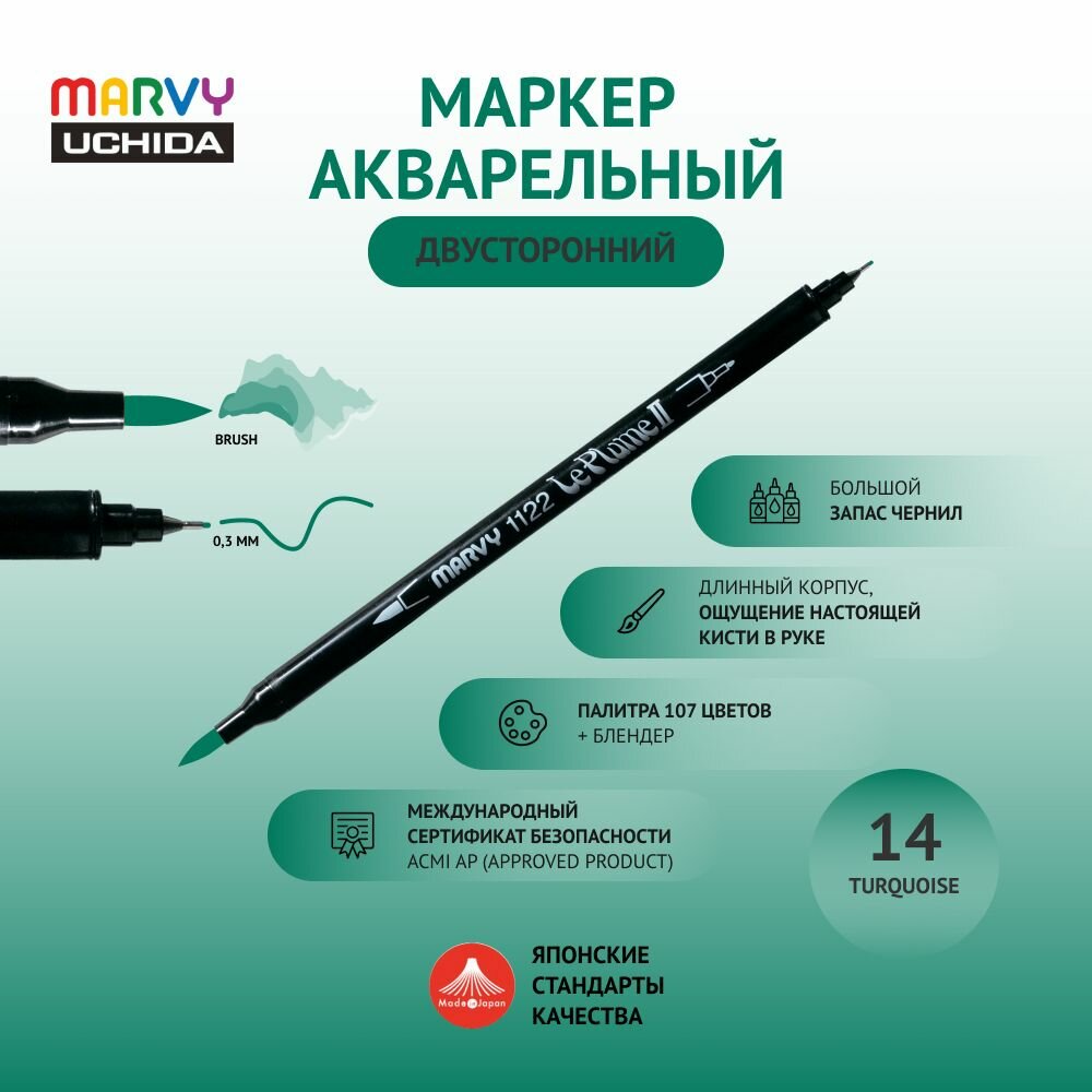 Купить Маркер Marvy Uchida для скетчинга акварельный двусторонний (кисть/капиллярная ручка 0.3мм) бирюза MAR1122/14
