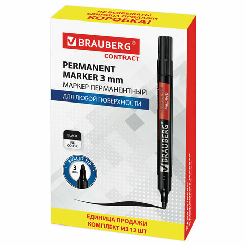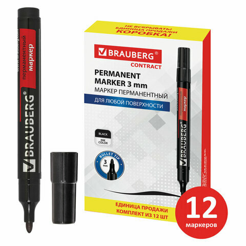 Маркер перманентный 12 шт черный BRAUBERG "Contract" круглый наконечник, 3 мм, без клипа, 1 упаковка
