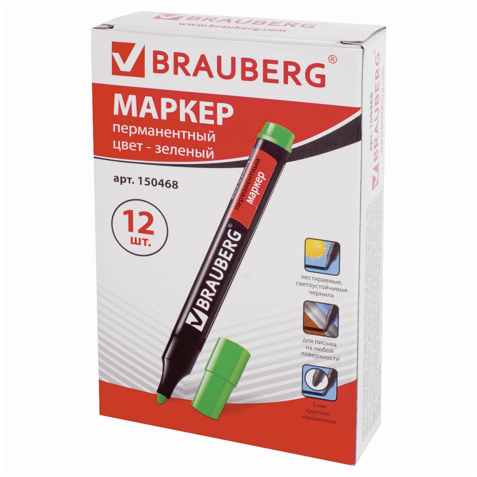 Маркер перманентный 12 шт зеленый BRAUBERG "Contract" круглый наконечник, 3 мм, без клипа, 1 упаковка