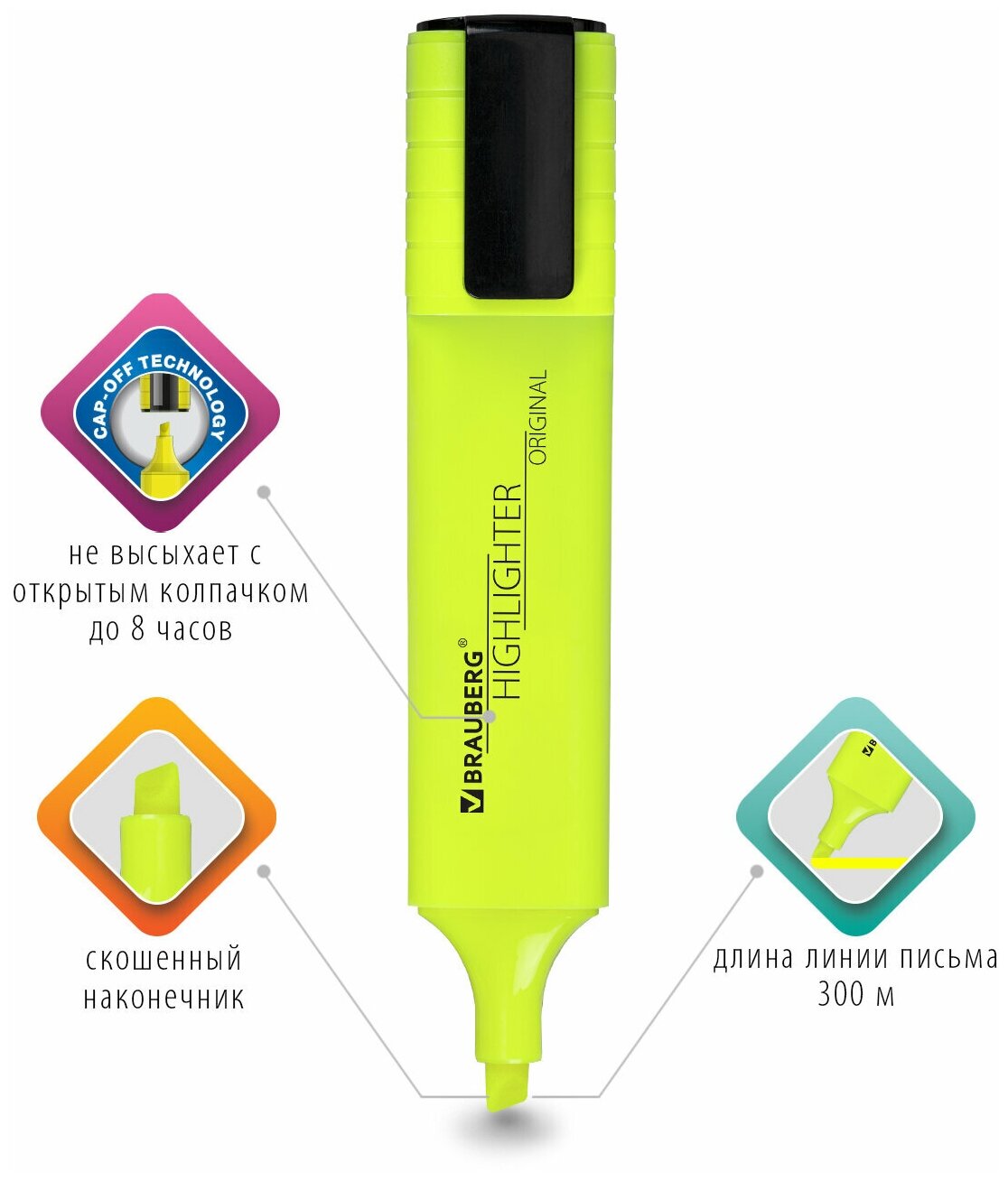 Маркер-текстовыделитель (для выделения текста) 4 Цвета, Brauberg Original Neon, линия письма 1-5 мм, 152215