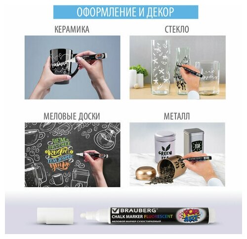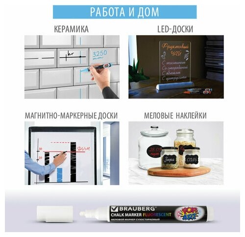Маркер / фломастер меловой стираемый для доски и других поверхностей Pop-art Белый, 15 мм, стираемый, для гладких поверхностей, Brauberg, 151537