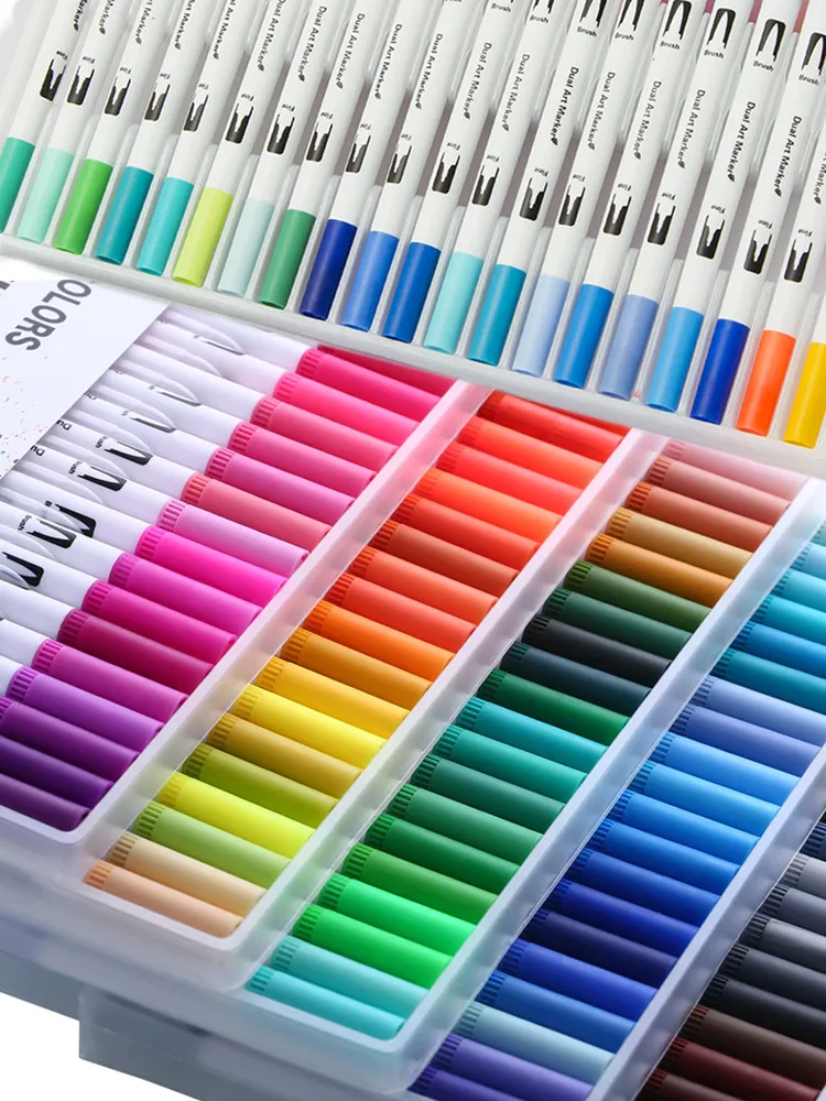Акварельные маркеры для скетчинга с кисточкой, линеры цветные на водной основе, набор профессиональных двусторонних фломастеров в пенале (100 цветов)
