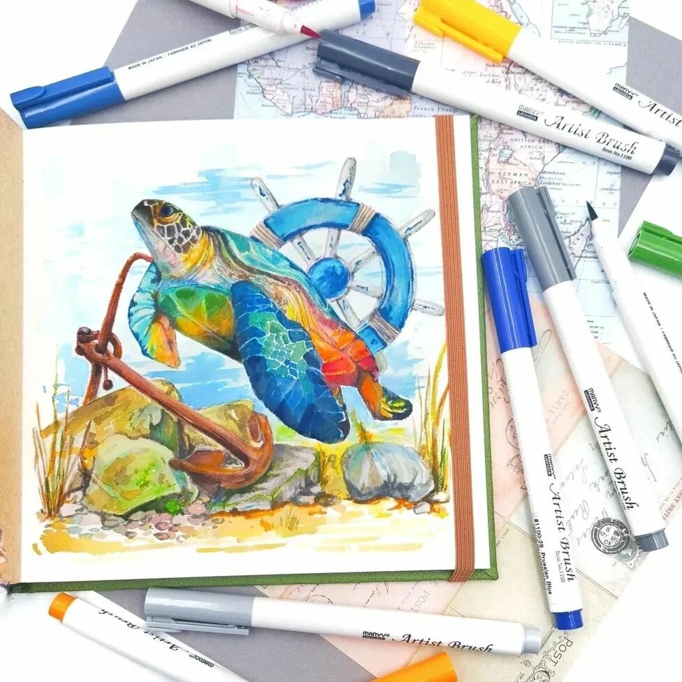Маркер Marvy Uchida акварельный (кисть) для скетчинга аквамарин (цвет морской волны) MAR1100/74