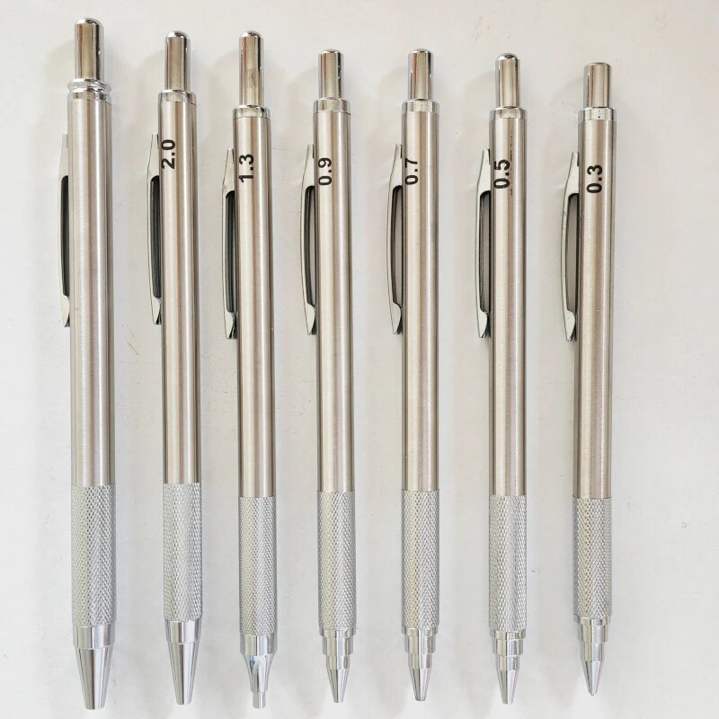 Механический карандаш металлический серебристый 0.3 0.5 0.7 0.9 1.3 2.0 3.0 мм, 6pcs 0.5mm leads