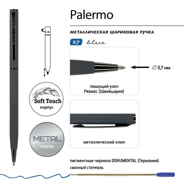 Ручка шариковая поворотная, 0.7 мм, BrunoVisconti PALERMO, стержень синий, металлический корпус Soft Touch синий, в футляре