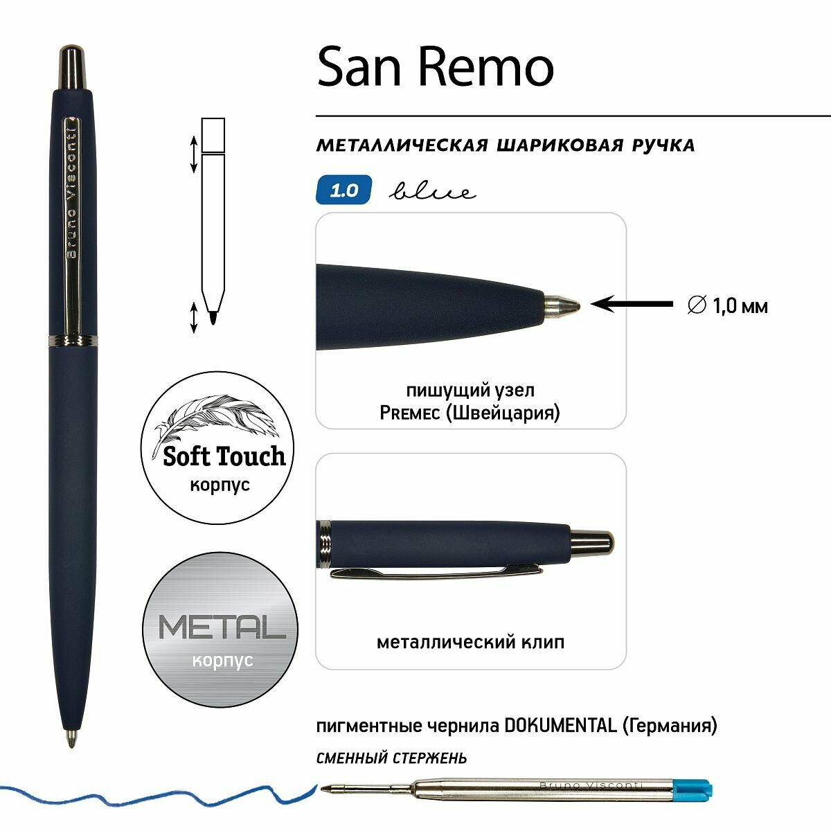 СохранитьРучка шариковая автоматическая BrunoVisconti "SAN REMO" цвет корпуса темно-синий 1 мм, синий, в картонном синем футляре интересное: