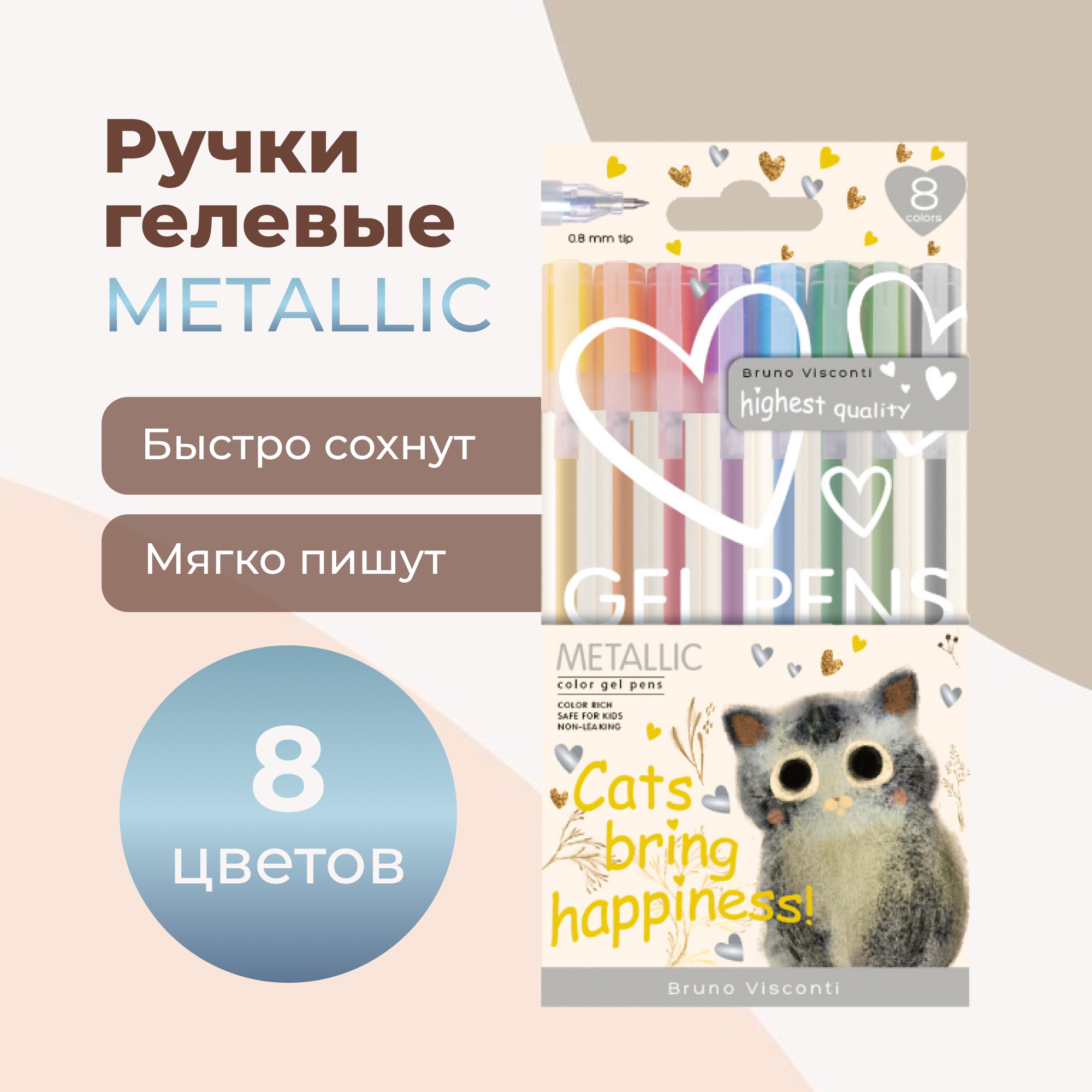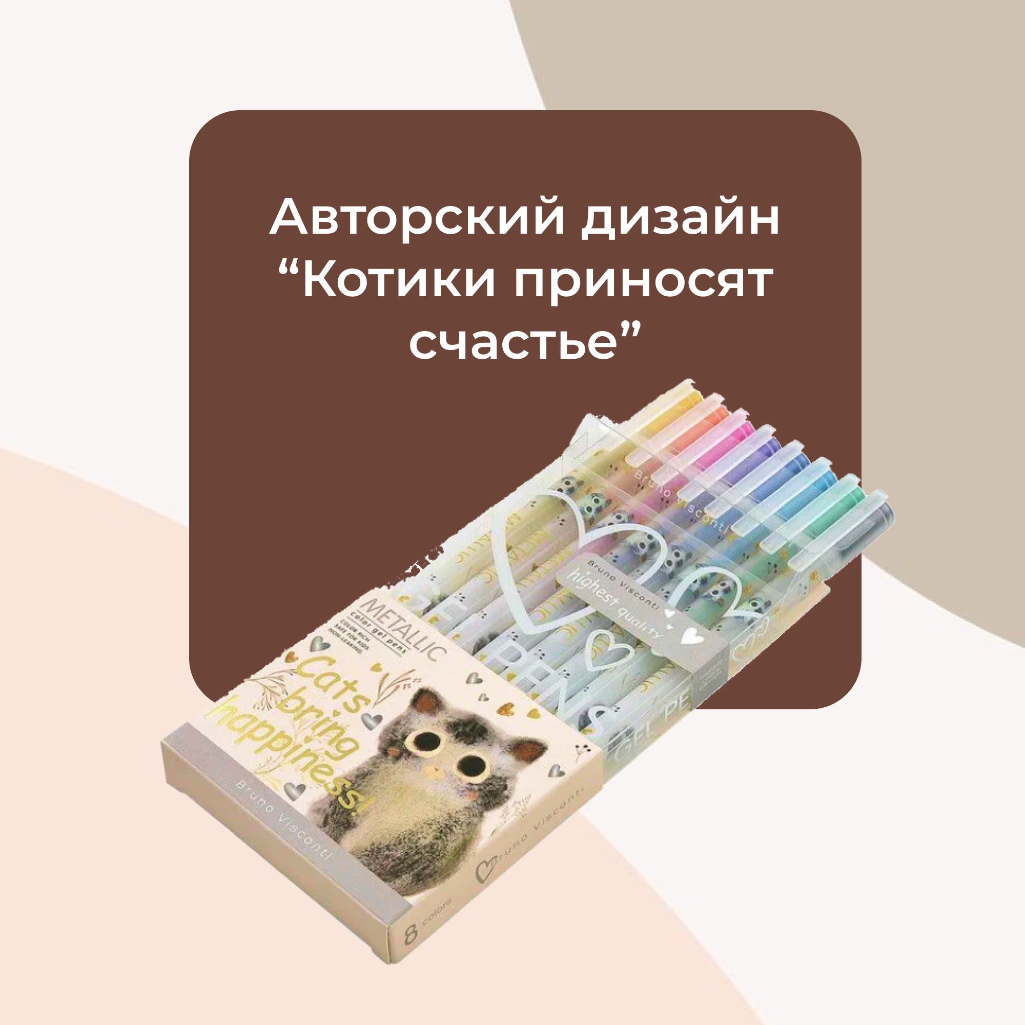 Набор гелевых ручек Bruno Visconti UniWrite "METALLIC. Котики приносят счастье" 8 цветов, 0,8мм интересное: