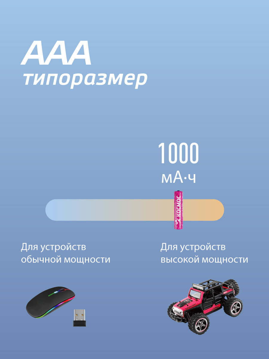 Аккумуляторные батарейки ААА / R03 Ni-Mh 1100MAH, в упаковке: 2 шт. Космос
