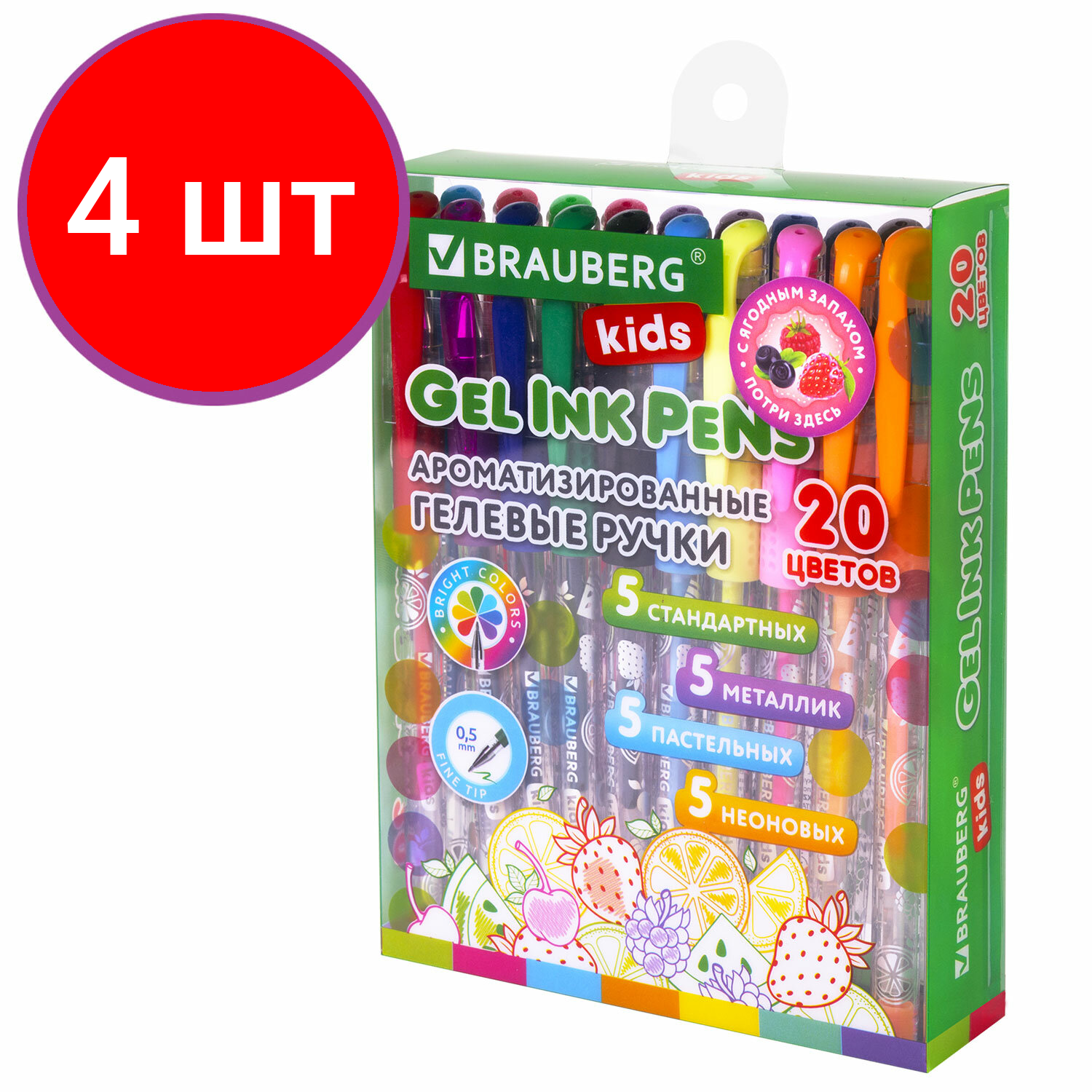Купить Комплект 4 шт, Ручки гелевые с грипом ароматизированные, набор 20 цветов, "FRUITS", линия письма 0.5 мм, BRAUBERG KIDS, 143824