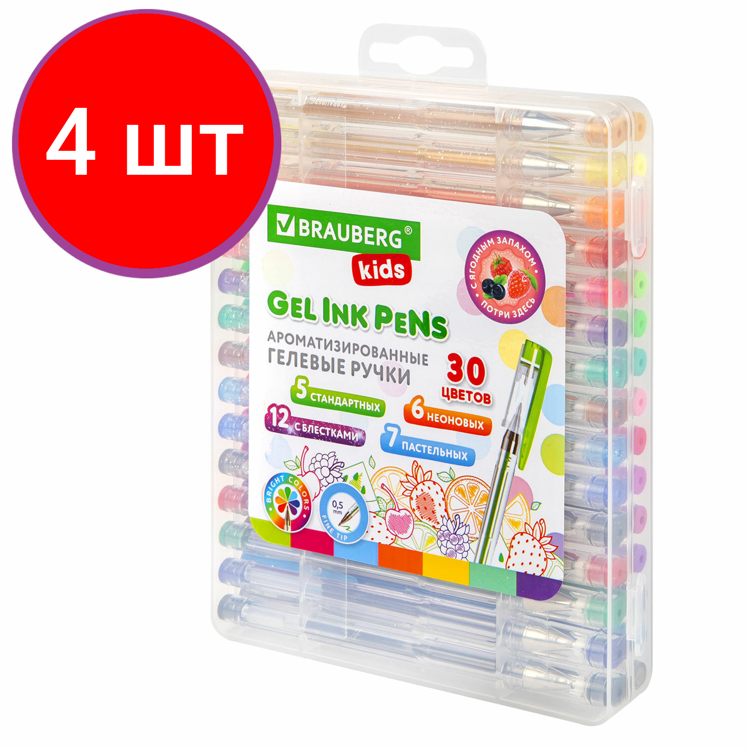 СохранитьКомплект 4 шт, Ручки гелевые ароматизированные, набор 30 цветов, "FRUITS", линия письма 0.5 мм, BRAUBERG KIDS, 143823 интересное: