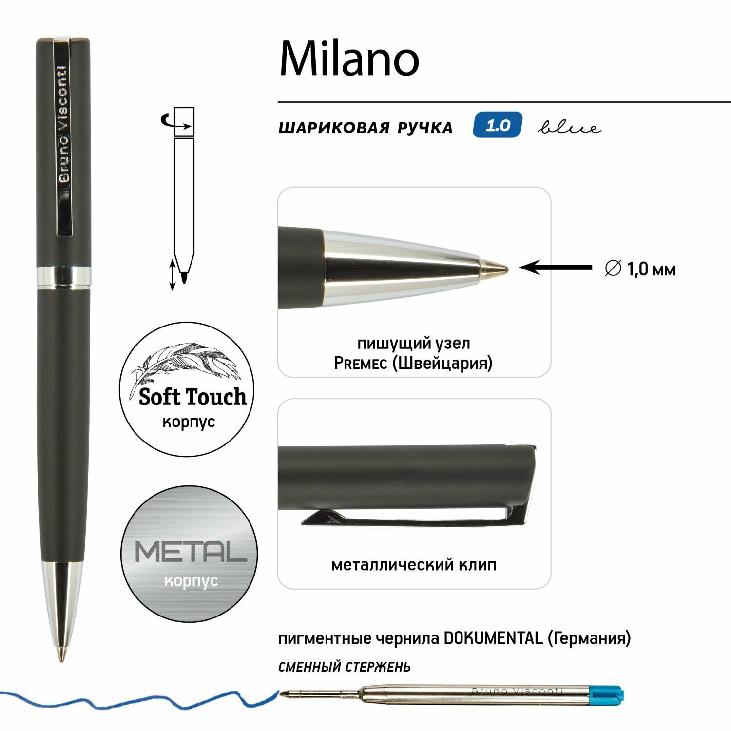 Ручка «Milano» шариковая автоматическая, Чёрный металлический корпус, 1 мм, Синяя интересное: