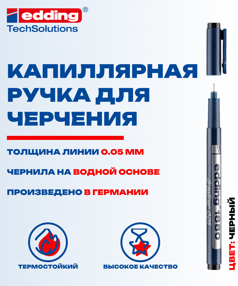 Капиллярная ручка (линер)- фломастер для черчения EDDING 1880 drawliner для эскизов, круглый наконечник, черный, 0.05 мм,