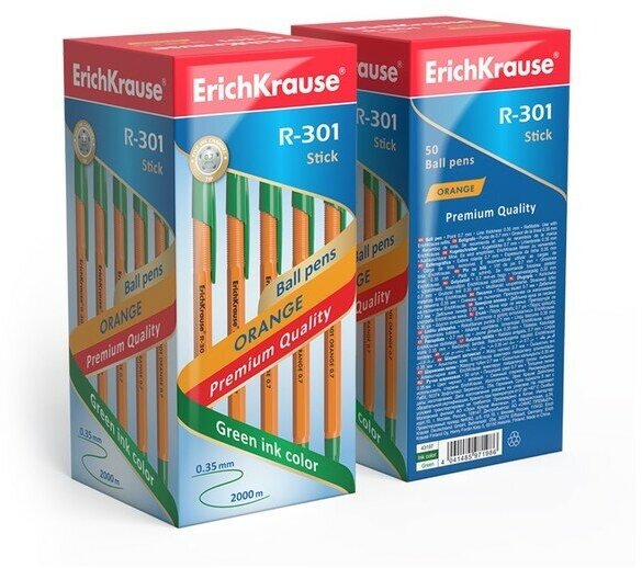 Купить Ручка шариковая ErichKrause R-301 Orange Stick, узел 0.7 мм, чернила зелёные, длина линии письма 2000 метров, штрихкод на ручке, 50 штук