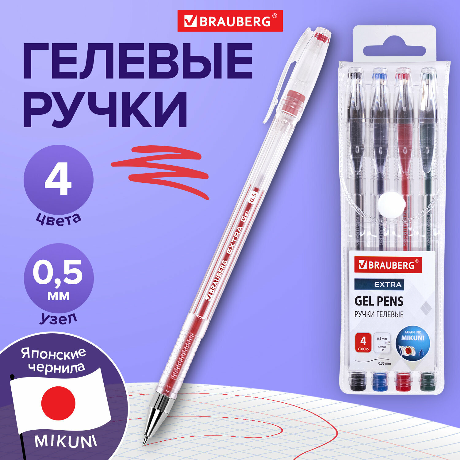 Гелевые ручки цветные набор 4 штуки для школы тонкие, узел 0,5 мм, линия 0,35 мм, Brauberg Extra, 143905 интересное:
